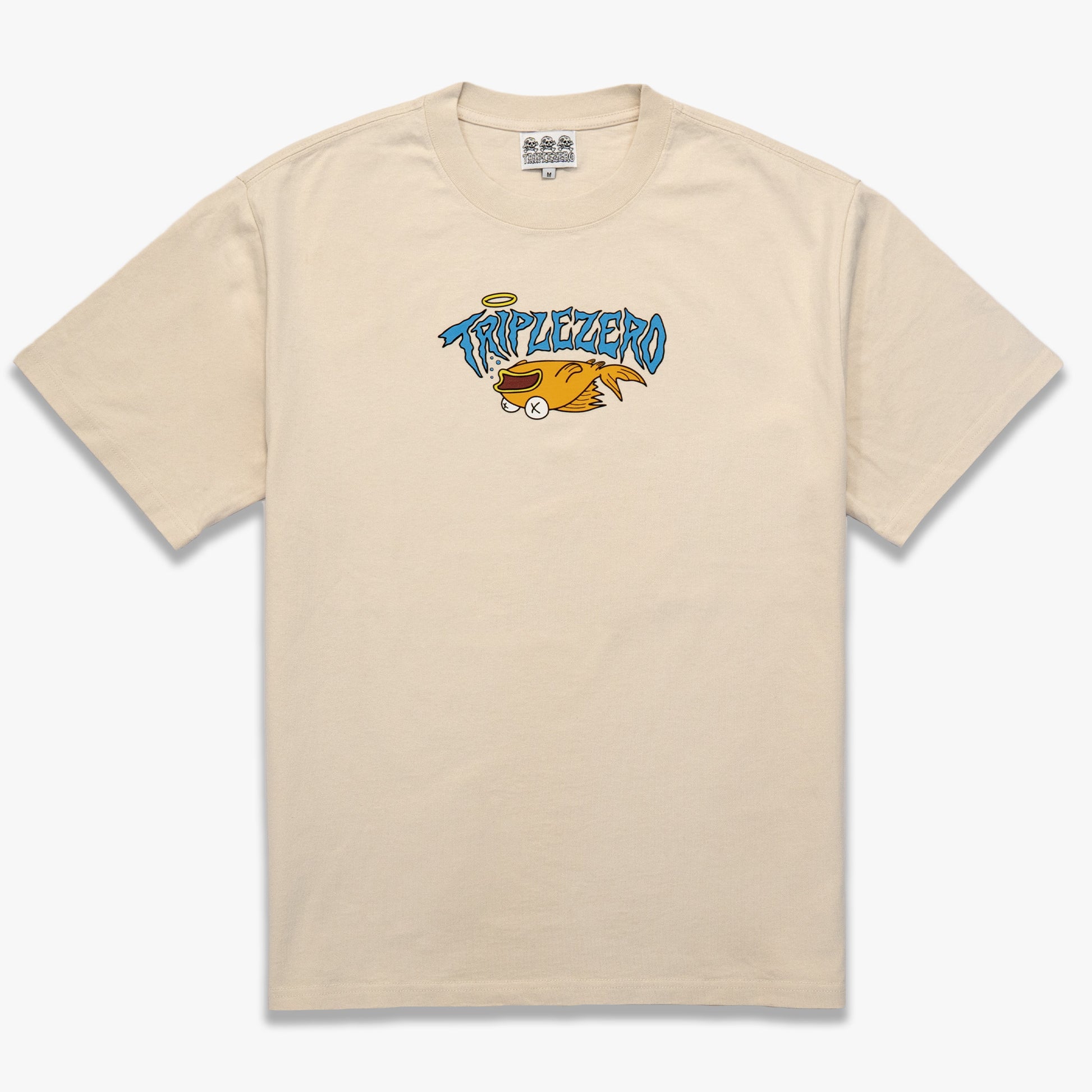 FISHY is screen printed on a super comfortable heavy weight, 240 GSM, 100% carded cotton oversized cream t-shirt.